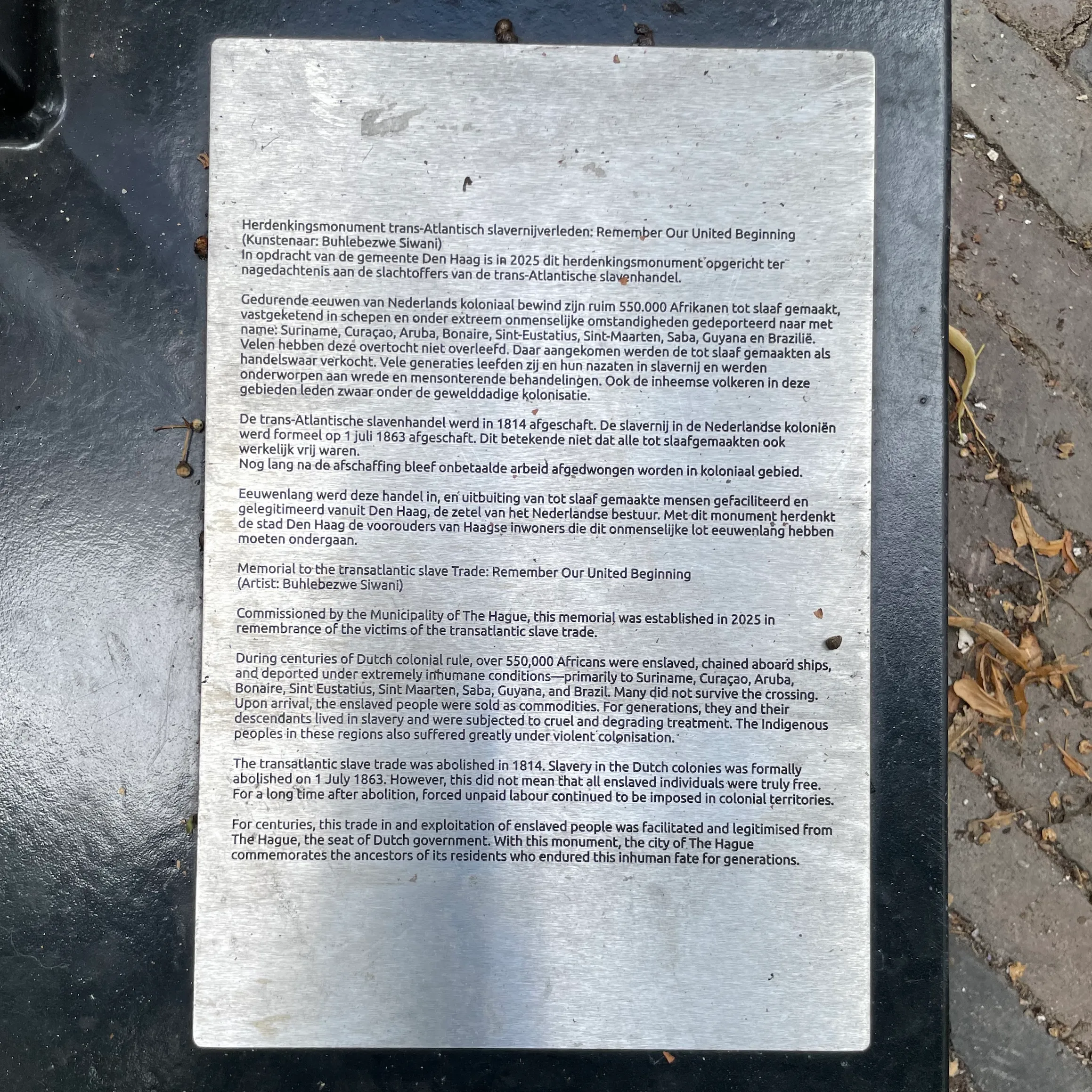 Het gedenkteken getiteld Remember Our United Beginning is ontworpen door de kunstenaar Buhlebezwe Siwani en staat op het Lange Voorhout in het hart van het bestuurlijke centrum van de stad. Buhlebezwe Siwani presenteert met Remember Our United Beginning een krachtig en sprekend monument, dat verwijst naar het gezamenlijk verleden en de gedeelde toekomst van Den Haag. Het werk heeft een grondvlak van circa 4,5 x 4,5 meter en een hoogte van 2 meter. Het is uitgevoerd door Studio RAW in Zwolle (Ronald Westerhuis).